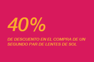 Por la compra de un lente de sol llévate otro par de lentes de sol con 40% de descuento. El descuento aplica sobre el precio de etiqueta del producto de menor valor y no es acumulable con otras promociones, convenios ni descuentos. Para acceder a la promoción la compra debe realizarse el mismo día y registrarse en un mismo comprobante. Para mayor información comunicarse al 0800-1-4600 de lunes a sábado de 10:00am a 7:00pm. Opticas GMO Perú S.A.C. RUC N° 20467675436